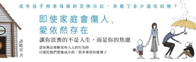 直到我遇到了許皓宜老師的書「即使家庭會傷人,愛依然存在」,透過書中虛擬的母女交換日記帶領我面對內心那個焦慮的小孩,在很多時候透過書中的對話,好幾次都帶我到那最深處的自己,每次都讓我不禁要停下來暫停一段時間才能繼續看下去,畢竟當習慣於面對外在的世界,並在那大染缸奮鬥對抗著外面的風雨吹殘,已經把自己武裝到自己都不知道有多厚的心防,因此當要回過頭向內面對尋找自己,那真的不是件易事!
