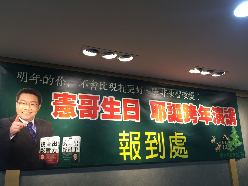 而真正開始與憲哥熟識的契機應該就是我兒和我老婆還在月子中心時的某個將近聖誕節的夜晚,我獨自外出前往參加憲哥的生日耶誕跨年演講暨舊書改版新發行「明年的你,不會比現在更好~除非練習改變」,這對我來說是個很特別的嘗試,畢竟以往的我對於這類的講座幾乎都是敬謝不敏的,因為講者講得不好那對於我來說,我寧可將時間花在剛出生的兒子身上,但當時的我只覺得在專簡演練時聽了憲哥這樣精闢的講評,想必這演講也是有40%的把握精彩可期啊!