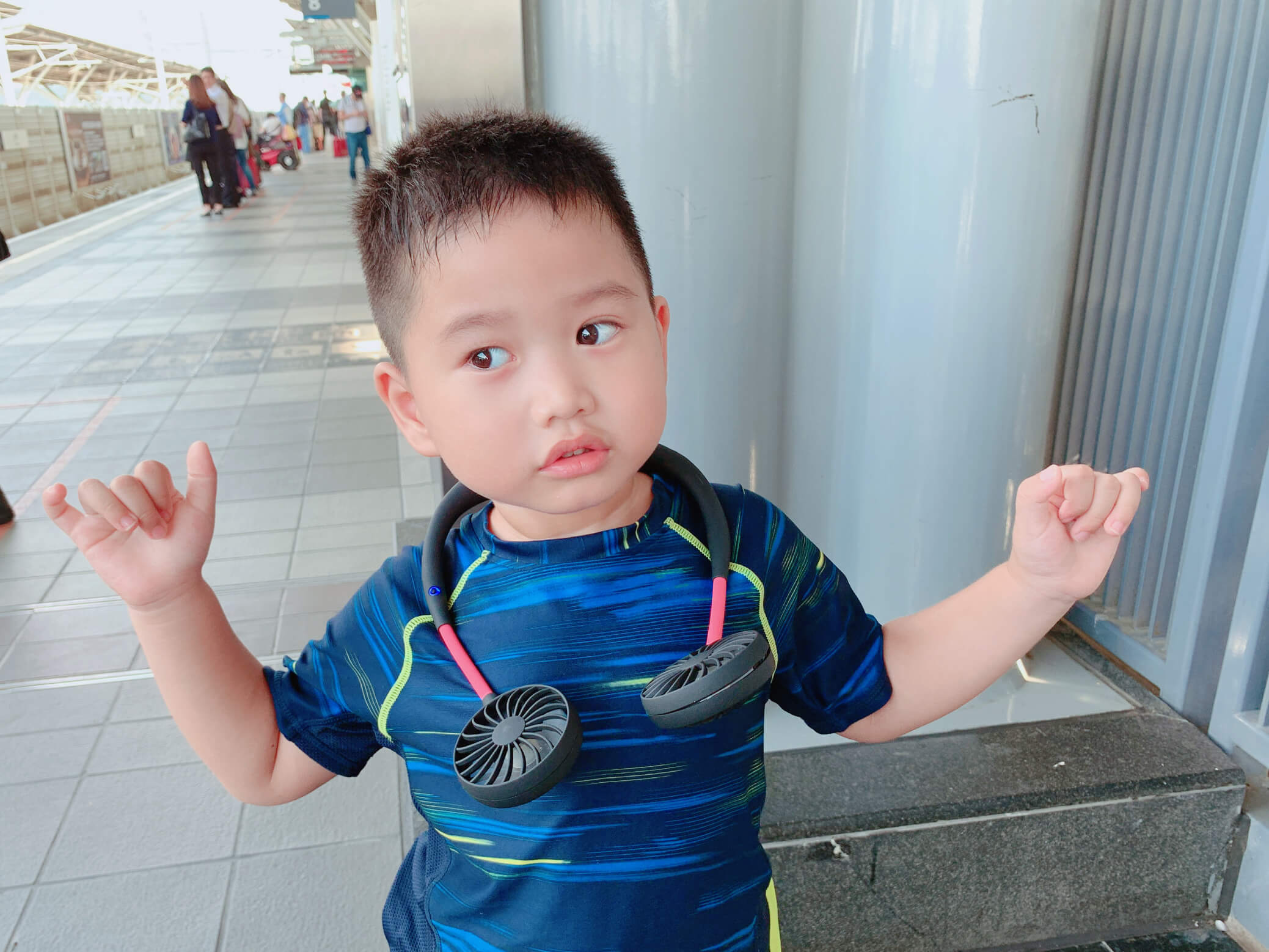 我立刻拿出頸掛式風扇,小孩開心手足舞蹈起來(但這樣不是更熱嗎?)不過跳起來也沒有掉喔!