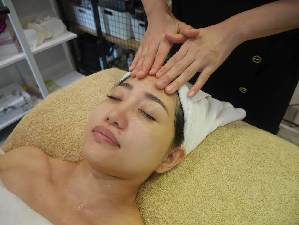 卸妝潔顏後會先用毛巾按摩,讓臉部殘留的化妝品、髒汙卸除。不只是臉部的照顧,連頸部和上胸部位,美容師都會用保養產品或溫毛巾加上非常輕柔卻有力道的手技,由於之前都是用洗臉巾卸妝的我,第一次感受到溫溫熱熱的毛巾搭配卸妝產品,讓臉部肌肉放鬆之外,疲憊感也能一掃而空。