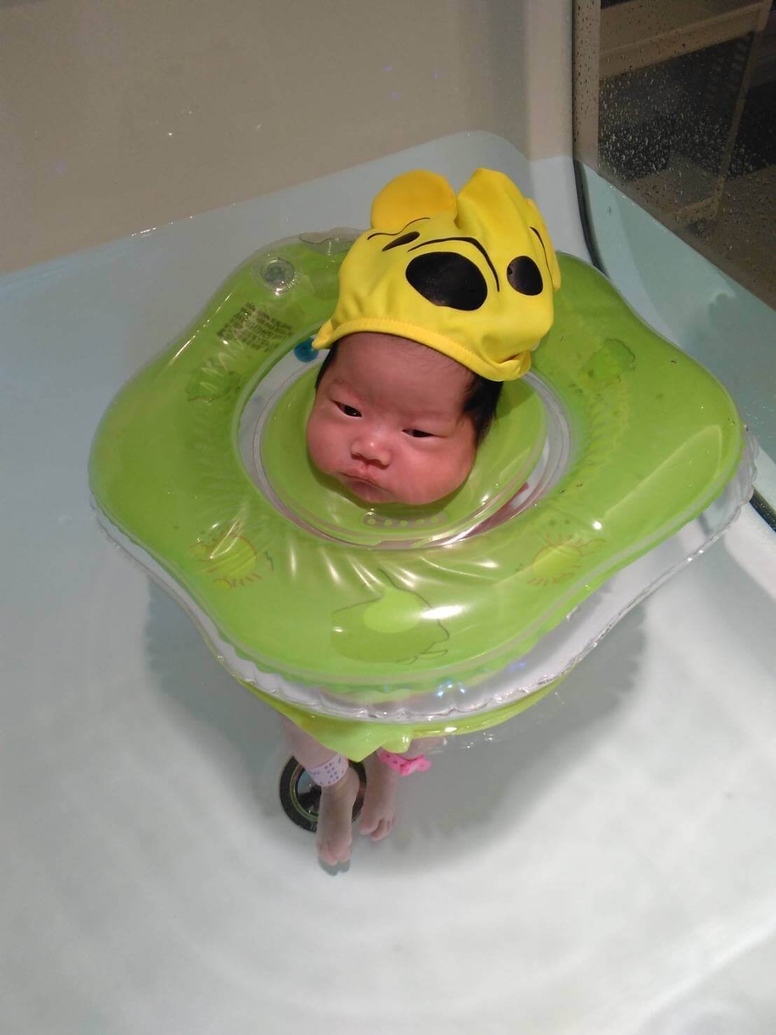 女兒體重持續緩慢增加,也許擔心離院時應該不夠3000公克,紅屁股嚴重就享受不到附贈的寶寶游泳,但在護理人員接力照顧之下,竟然體重到達紅臀也緩解到微紅,讓我們在離院的前一晚上壓線排到時間,可以捕捉到她第一次玩水的珍貴畫面。