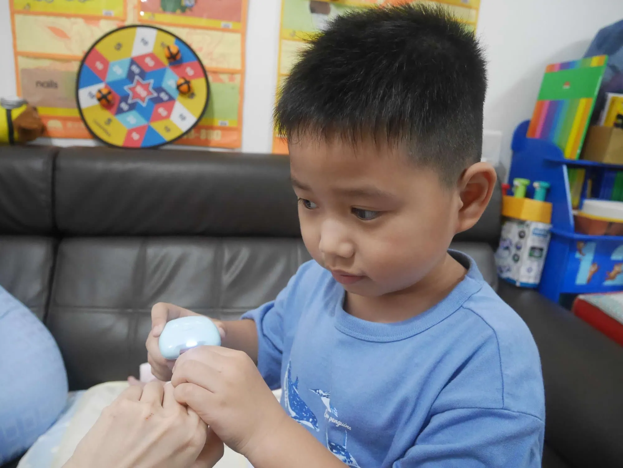 我只教一次使用方式,兒子就立刻上手,跟我要求他想要自己使用,剪完自己的還意猶未盡的想幫我修剪,用起來有摩擦的震動感,大人其實也可以使用,只是光用這個機器的話可能有人會嫌速度慢,我都用一般指甲剪完之後,再用自動指甲剪把指甲磨得圓滑不尖銳