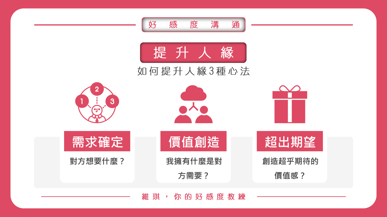 你想要與人產生好感前,先讓站在對方的角度來,自己對方在乎的是什麼,我又能帶給對方什麼價值。你可以藉由以下三個思考點來檢視: