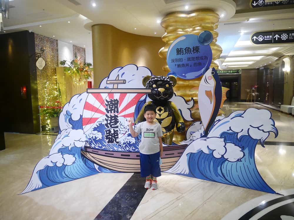 潮港城國際美食館背後是廣大潮港城餐飲集團(C.K.C. GROUP),為中部地區知名的餐飲巨擘,在太陽百匯這裡不定期都會有許多有趣活動,像近期2021/04/12(一)至2021/05/28(五)就是鮪魚季,我們一進門就看到超大的鮪魚船,船上還有很大隻的庫柏力克熊呢,一進門就看到有趣的活動,只要在Facebook活動貼文或潮港城國際美食館Google評論留言,憑截圖出示給服務人員,即可獲得期間限定的「鮪魚祭.日本扇乙支」。我兒子好喜歡那把扇子。