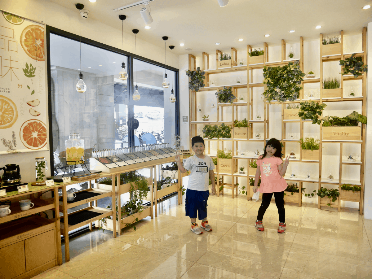 旁邊櫃台上面是被綠色植披覆蓋,旁邊的牆面是多肉植物區還有植物精油聞香區,上方還垂吊著各式的水草燈,身在這樣的建築森林內真的很讓人療育放鬆。