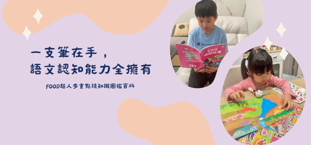 這次入手的整組圖鑑百科中包含1組FOOD超人多重點讀筆、精裝《FOOD超人兒童認知圖鑑》、4本國學啟蒙學習書、6張學習掛圖、6本雙語童話繪本、18張認知雙面點讀板、10張音樂欣賞及音樂遊戲點讀板、4本趣味遊戲貼紙書、2張錄音貼紙,涵蓋的知識學習面很廣也很有趣,有了它我真的剩下陪伴、鼓勵和觀察的角色,不用先自己閱讀知識輕鬆不少。 而且過去舊版只有中文和英文,新版教材又加入台語,多重語言交集開啟有趣的多語言環境,我們出門露營也有點讀筆和書帶去,在戶外玩累了休息吹冷氣時邊玩它。